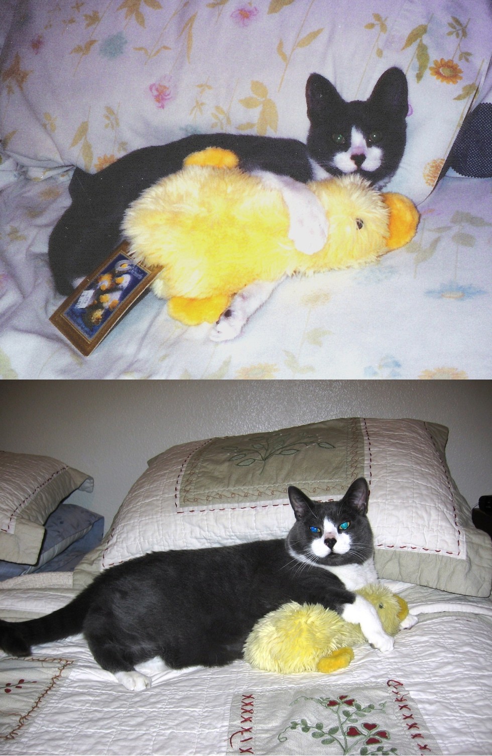 Dice l’umano di questo bellissimo gatto: “Quando venne a casa con noi aveva 5 mesi e portò con sè questo giocattolo. Il suo umano precedente ci disse che era il suo preferito, deve essere veramente così!”.