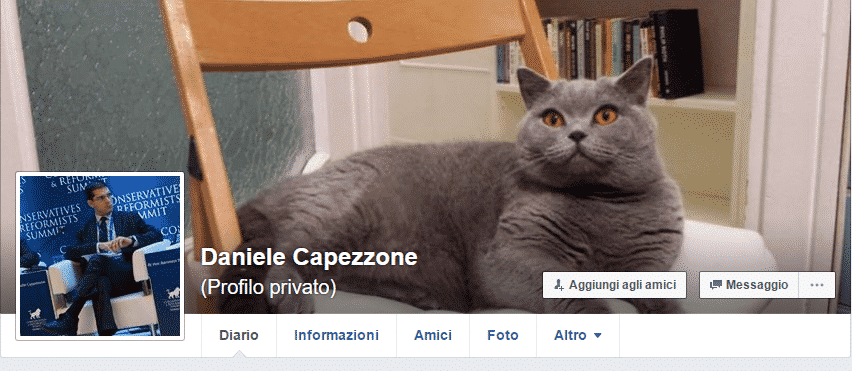 Questa è l’immagine di homepage dei profili Twitter e Facebook di Daniele Capezzone. Come si può vedere, in entrambi i casi Giuditta troneggia come immagine di sfondo, cosa che rende la sua presenza visiva ben più cospicua di quella del suo umano.