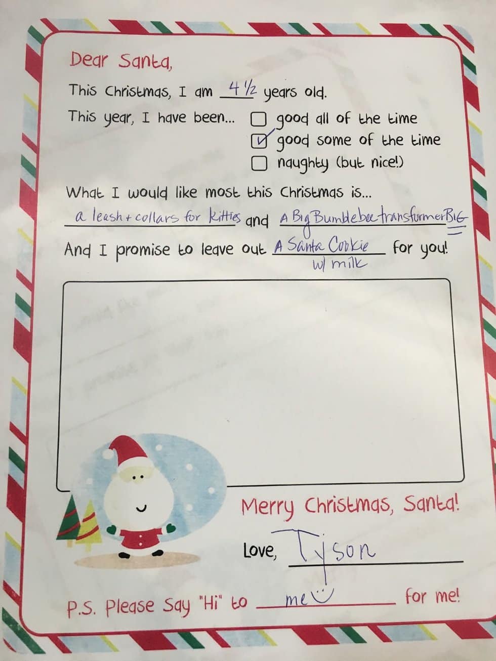Tyson, nonostante abbia perso la casa che condivideva con i genitori, ha sofferto molto per la situazione, l’unica cosa che gli importasse davvero era ritrovare i suoi amati gatti. E allora ha deciso di scrivere una lettera a Babbo Natale.